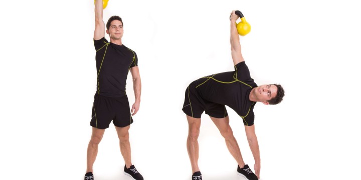 4) Cofając biodra w stronę ramienia utrzymującego kettlebell, pochyl tułów w przeciwną stronę, prowadząc wolną rękę po nodze znajdującej się po przeciwnej stronie kettlebell.